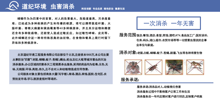 专业的蟑螂治理公司会根据您家的实际情况制定专门的治理方案,根据蟑螂活动规律以及频繁出现区域进行重点治理消杀,阻止蟑螂产卵孵化,彻底消除蟑螂。道纪环境支持北京区域内免费上门,根除蟑螂找道纪,咨询电话010-68818919,4000078816