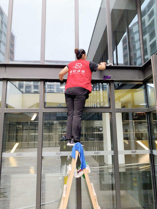 图为道纪环境玻璃清洁工作人员正在进行顶面清洁