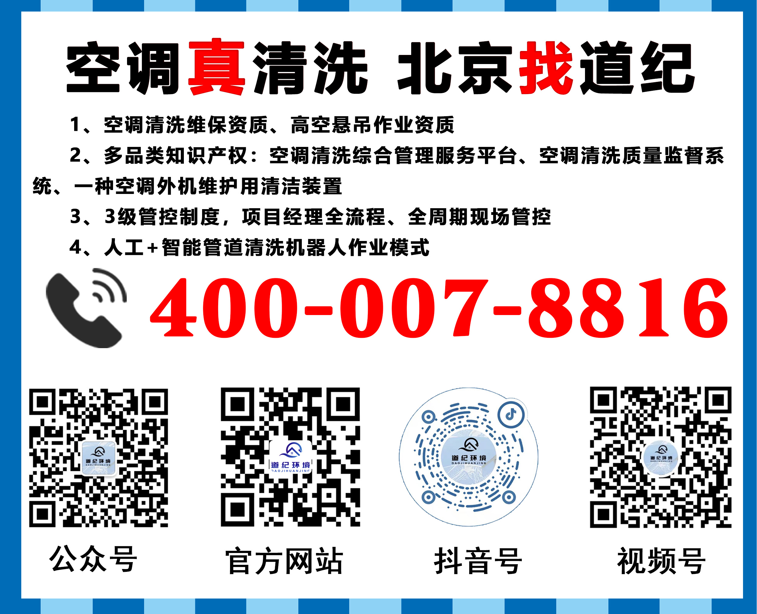 北京专业空调清洗公司就找道纪环境,全套资质,自营团队,人工+AI管道清洗机器人,多平台监督质量系统。空调真清洗,就找北京道纪。空调清洗服务电话010-68818919,服务微信13021200500