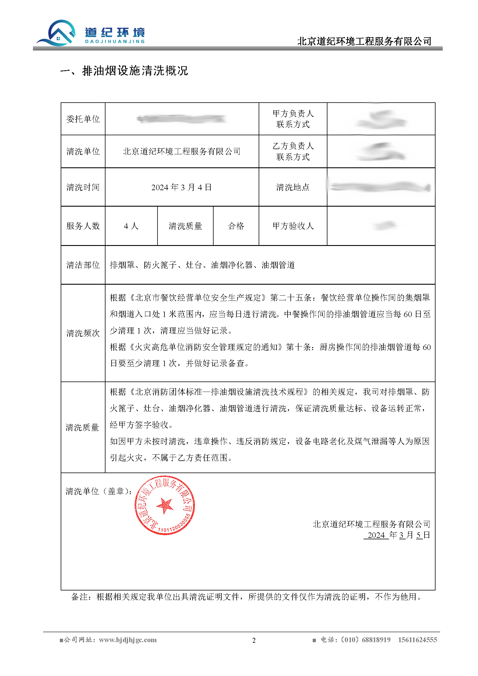 5.清洗验收报告一式两份,排油烟清洗单位与甲方单位各保留一份,存档备查。